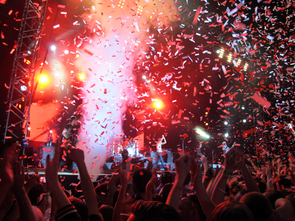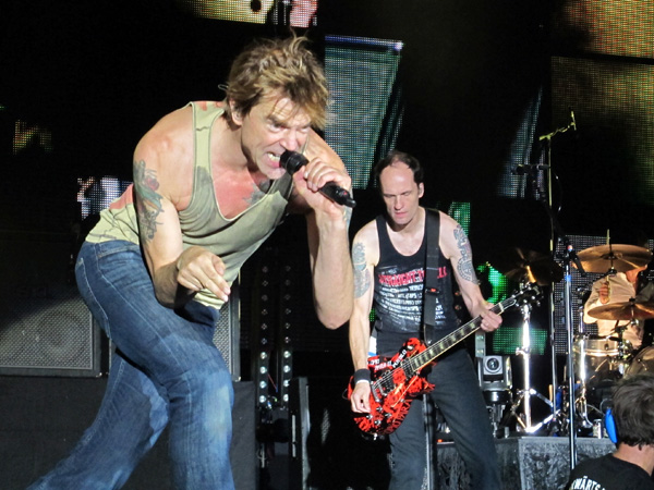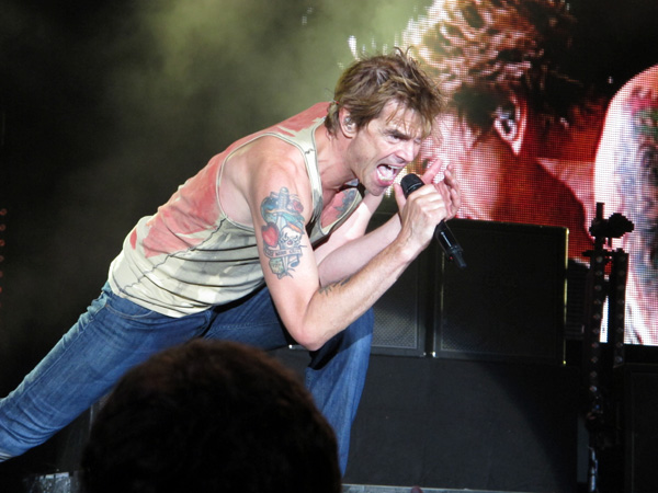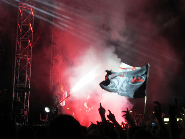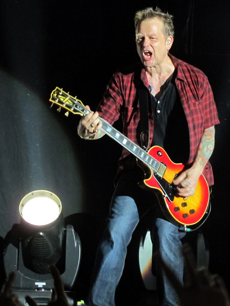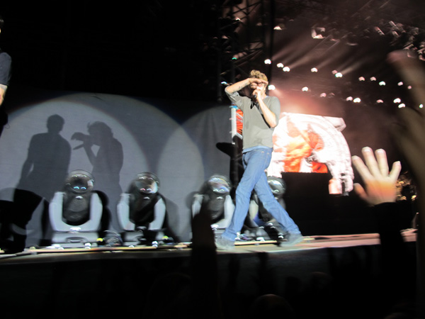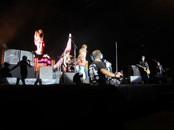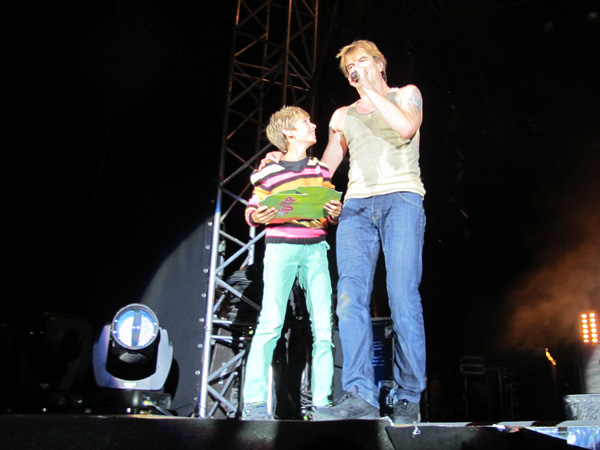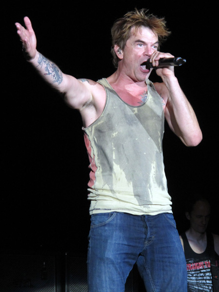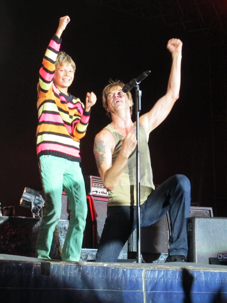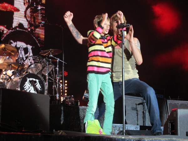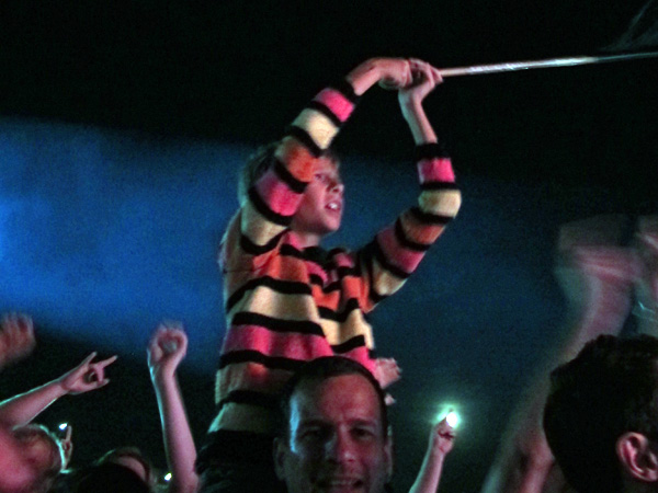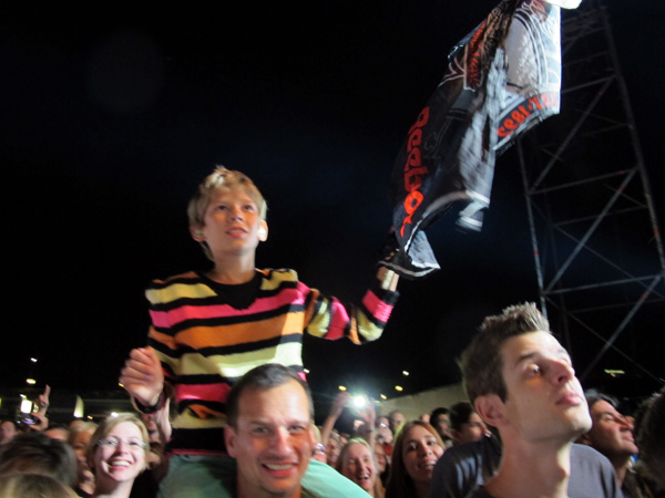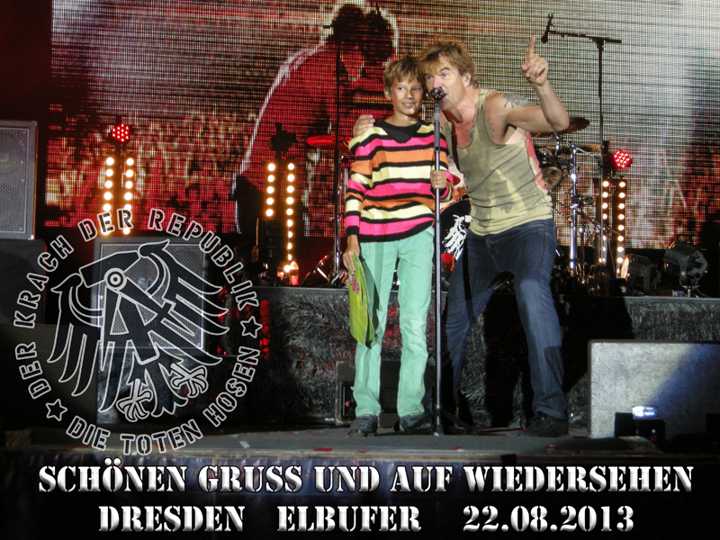 ein ganz besonderer Abend für Sebastian werden. Sebastian verbrachte fast das gesamte Konzert auf meinen Schultern. Campino entdeckte ihn dort recht bald, da der Kult-Pulli nicht zu übersehen war, und fand scheinbar viel Freude daran. Bei Paradies versuchte Campino Sebastian zu überzeugen auf die Bühne zu kommen und das Lied zu singen, doch er weigerte sich beharrlich. Später als "schönen gruß, auf wiedersehen" lief unterbrach Campino den Song und holte nun Sebastian auf die Bühne, Widerrede zwecklos. Sebastian wollte erst nicht, doch Campino sagte, der Papa wartet hier vorn im Graben und passt auf, also konnte ich noch ein paar Bilder und ein kurzes Video machen, was wiederum Schande nicht gefiel. Die beiden rockten nun gemeinsam den Song.Als Campino ihm dann das Mikro hin hielt um jemanden zu grüßen verschlug es ihm die Worte... |
