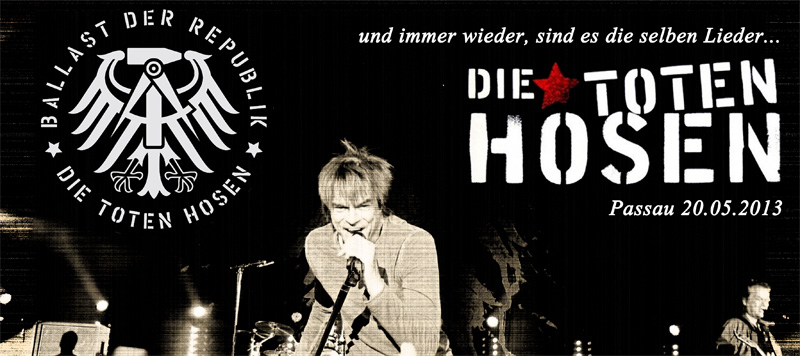 | Die Setlist von Passau: Drei Kreuze (Intro) Ballast der Republik Altes Fieber Schade scheiße Auswärtsspiel Das ist der Moment Alles was war Heute hier, morgen dort Bonnie & Clyde Ein guter Tag zum fliegen Sascha Paradies Niemals einer Meinung Europa Pushed again Schrei nach Liebe Alles wird vorübergehen Liebeslied Steh auf Alex Wünsch dir was Tage wie diese ---------------------- Draußen vor der Tür All die ganzen Jahre Far far away Freunde -------------------- Alles aus Liebe Vogelfrei 10 kleine Jägermeister Schönen Gruß Bis zum bitteren Ende Reisefieber Walk on Ausverkauft mit etwa 7000 Leuten |