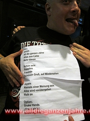 SETLIST Kesselhalle: Heino Medley /+ Der wahre Heino Liebesspieler Glückspiraten Und wir leben Auswärtsspiel! Alles was war Modestadt Düsseldorf Bonnie & Clyde 1000 gute Gründe Was macht Berlin? Traurig einen Sommer lang Wort zum Sonntag Pushed again Verschwende deine Zeit Steh auf, wenn du am Boden bist Du lebst nur einmal (vorher) Drei Worte Liebeslied Hier kommt Alex Wünsch DIR was Tage wie diese Strom All die ganzen Jahre Freunde Mehr davon Schön sein Paradies Alles aus Liebe Schönen Gruß, auf Wiedersehen Bayern Alles wird vorübergehen Blitzkrieg bop (Original: Ramones) You′ll never walk alone -quelle: DTH-DTA.de - |