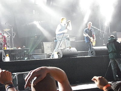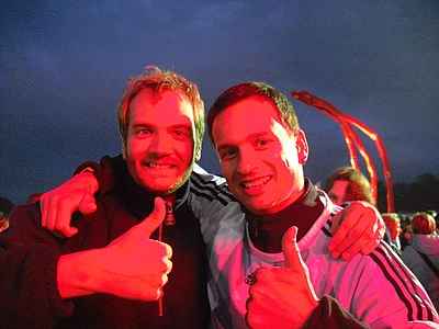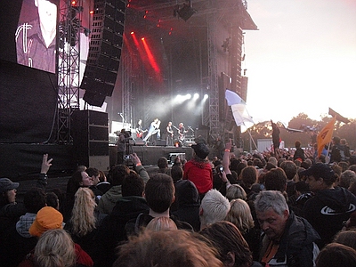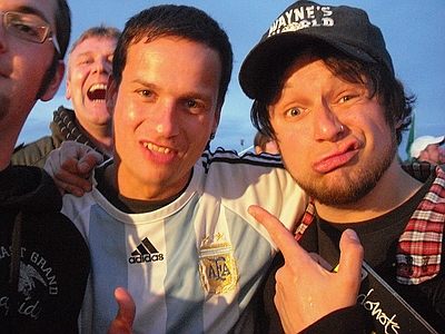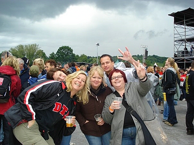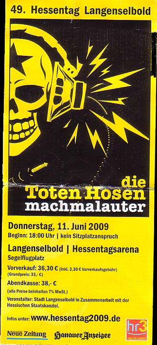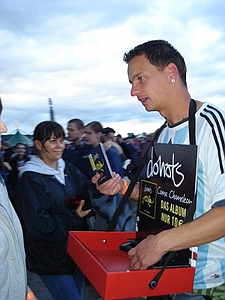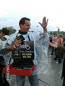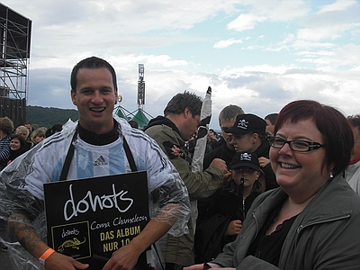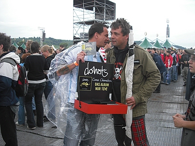 Langenselbold "Hessentage" Auf besonderen Wunsch von Pennsocke aka Arabell wird der Bericht mal wieder ein wenig ausführlicher. Gegen Mittag endlich das Zelt auf Parzelle 43 aufgeschlagen, wahrscheinlich lacht die Prinzessin von der Reservierung heute noch. Meine Frage vorab war „brauch ich ´ne Reservierung für mein Einmann-Zelt?“ Ihre Antwort war daraufhin „Nein, aber ich buch Dir mal Parzelle 43!“ Also fuhr ich mit meinem Auto über den Campingplatz und suchte Parzelle 43, es waren jedoch nur Wohnwagen auf dem Platz, also fragte ich den Sheriff der Anlage, der mich dann ins benachbarte Schwimmbad am See schickte, dort angekommen, durfte ich mein Zelt dann zu den anderen auf die Wiese stellen, von wegen Parzelle, aber ich hab auch gut gelacht. Anschließend durch Langenselbold geschlendert, tausende Fress- und Saufbuden, lecker Bratwurst, aber beschissenes Bier. Die Stadt war komplett für den Verkehr gesperrt und es schlenderten 1000´ de durch die Strassen. Unheimlich viele mit Hosen-Shirts, einfach nur genial. Nach dem die ersten Biere gezischt waren, ging es Richtung Hessentag-Arena, wo die Hosen vor etwa 22.000 Fans spielen sollten, es regnete immer wieder mal und so kaufte ich mir für 2,00 Euro einen Designer-Regenponscho (schreibt man das so?) Ach ja, ich sollte ja noch CD´s der Donots verkaufen, also nochmal den Norbert angerufen und gefragt ob alles klar geht. Sehr gut, statt 16:00 Uhr (wo auch Einlass war), sollte der Verkauf erst gegen 18:00 Uhr losgehen. Also noch schnell meine Freikarte, die die Bezahlung für den Einsatz war abgeholt und ab zu Pennsocke, Batschlapp und den anderen in der ersten Reihe, Bändchen für den ersten Wellenbrecher geholt (gleich 2 genommen, damit es da vorn nicht so voll wird) und wieder Bierchen gezischt. Zwischenzeitlich trudelten auch die ersten alten Bekannten ein. Grüße an Roland, Wahnsinn, sich einfach so in der Meute zu treffen. Um 18:00 Uhr begannen Ohrenfeindt zu spielen und ich startete meinen CD-Verkauf. Batschkapp hat in Karlsruhe 9 Stück vorgelegt, die galt es also zu schlagen. Als die Donots begannen gab ich meinen Bauchladen zurück und hatte bis dahin 8 CD´s verkauft (und 55 Schluck Bier von Nichtkäufern erhalten). Die Donots rockten gut los und zwischenzeitlich erzählte Jessi, sie hätte Ingo von den Donots kürzlich geheiratet. Spontan packten wir sie auf meine Schultern und gingen in die ersten Reihen vor, um sie zu ihrem Mann zu bringen, der sie gleich sah und vor Schreck stolperte. Als die Donots fertig waren holte ich wieder meinen Bauchladen und verkaufte bis zum Beginn der Hosen fröhlich weiter. Zwischenzeitlich goss es aus Kübeln und mein Bauchladen war ein kleiner Swimmingpool. Die Leute hatten scheinbar Mitleid und neben Bier und Apfelwein aus hunderten Bechern (hey, wenn einer die Schweinegrippe hatte, dann haben sie jetzt alle) verkaufte ich noch 30 CD´s. Mit insgesamt 38 verkauften CD´s war ich laut Norbert der Rekordverkäufer des Donots Streetteams. Zur Belohnung gab es noch eine CD für lau, die ich dann noch von den Donots für Sebastian signieren ließ (der findet die Donots jetzt eh viel cooler, als die Hosen). Pünktlich zu den Hosen war ich wieder vorn und es begann wie immer mit Strom und Du lebst nur einmal, danach wurde dem Wetter gehuldigt und die Jungs spielten „Singing in the rain“. Das Restprogramm war eigentlich wie immer, kein unplugged Teil und leider kein Medley mehr. Dafür aber Paradies, wo Campi mal wieder den Text vergessen hatte und spontan jemanden aus dem Publikum hoch holte, der dann weitersang, zwar auch falsch, aber man gab ihm die Chance sich zu beweisen. Nach dem Konzert bestand die Hauptaufgabe darin Parzelle 43 wieder zu finden. Einen freundlichen Polizisten gefragt, wo das Schwimmbad ist und 2 Minuten später stand ich vor ´nem geschlossenen Freibad, welches definitiv ein anderes war. Also weitersuchen und lieber die Feuerwehr fragen, weil die Polizei kennt sich eh nicht aus. Nach einem kilometerlangem Marsch fand ich dann mein Zelt und viel ins Koma, schade, die Jungs am Lagerfeuer waren sehr lustig. |