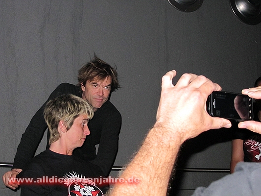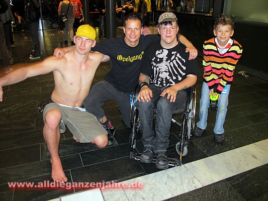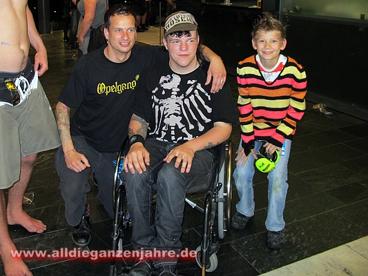 | - In der schönen Dogana-Halle sind uns gleich die Balkons aufgefallen, endlich ein Konzert an dem ich Sebastian nicht 2 Stunden auf den Schultern habe und am nächsten morgen ohne Rückenschmerzen aufwache? Also machten wir uns auf den Weg den Eingang zu den Balkons zu suchen. Diese wurden von einem Sicherheitsmann bewacht und alles bitten und verhandeln war zwecklos. Zugang nur für Behinderte und deren Begleitperson. (Und VIPs wie wir später feststellen konnten). Also wieder runter in den Innenraum "komm ich trag dich durch die Leute - hab keine Angst, ich gebe auf dich acht" Vorn links angekommen war es noch recht beschaulich, während ich lautundwild meinen gescheiterten Versuch erzählte den Balkon zu entern, stand plötzlich "MATZE" (hey - Du hast uns echt glücklich gemacht - 1000Dank dafür) neben mir und hatte einen Vorschlag, den ich ehrlich nur mit einem mulmigen Gefühl annahm. Matze hat nur wenig Sehkraft und hat uns gebeten ihn als Begleitung auf den Balkon zu bringen, später hat er uns einfach da oben gelassen und sein Glück wieder vor der Bühne gesucht. Einfach unglaublich. Hoffe wir treffen uns bald mal wieder. Wir haben uns dann neben die Rollstuhlfahrer gehockt, um nicht entdeckt zu werden und auf den Beginn des Konzerts gewartet. Plötzlich wären wir beinahe aufgeflogen, als Campino mit Security Toni unseren Balkon betrat, um zu schauen, wie hoch das da ist. Scheinbar war es ihm zu hoch, denn Campino kam während des Konzerts nicht wieder, um sich runter zu stürzen. Die Rollis warenm total glücklich, denn Campino nahm sich die Zeit für Fotos. Dann entdeckte er Sebastian mit seinem Campi-Pulli und grüßte kurz, ich gab ihm zu verstehen, dass wir nicht entdeckt werden wollen und dann war er auch wieder verschwunden. Security-Toni hat uns scheinbar nicht gesehen oder ein Auge zugedrückt. Anfangs waren wir mit den drei Rolli s allein, doch mit Konzertbeginn verliessen die VIPs ihre Schnittchen-Bude und stiessen dazu. Wir hatten ein echt tolle Zeit da oben und nette Leute kennengelernt, Basti aus Düsseldorf hat seinen Begleiter mit dem Konzert-Ausflug ziemlich überrumpelt, den dieser war nur mit Bermuda-Short und Kappe bekleidet und Barfuß. Auch ne nette Geschichte wie ein Rollstuhlfahrer mit Begleitung ohne Ticket in die Show gekommen ist. Auch herrlich wie alle abgefeiert haben, doch dazu später mehr!!! - |