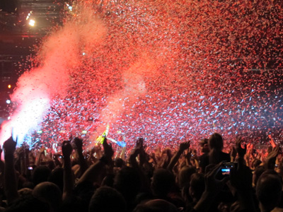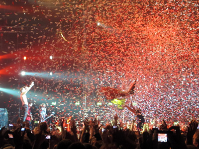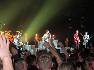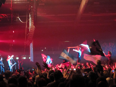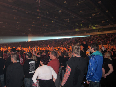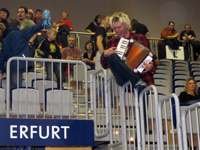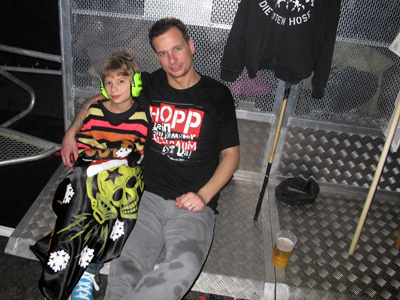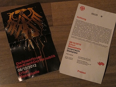 | ERFURT 08-12-2012 krach der republik Nachdem die OP von Alex gut verlaufen und der kleine Mann auch wieder daheim war, entschieden Sebastian und ich spontan nach Erfurt zu fahren. Vielen Dank an unseren Karten-Organisator! Erfurt war nach gut 90 Minuten erreicht und wir trafen uns auf eine Pizza in der Erfurter Innenstadt mit ein paar Boludos, um dann mit der Strassenbahn wieder zur Messehalle zu fahren. Ich nahm Sebastian die ersten Songs auf die Schulter und wir kämpften uns durch die Menge und hatten ordentlich Spaß. Leider ist unsere Fahne nach wenigen Liedern kaputt gegangen. Das Konzert war fest in Kinderhand, auch Rico und Marc aus Prittitz waren angereist und viele weitere Kids waren bei den Papis auf den Schultern. Punkrock für alle Generationen eben. Zur Halle ansich kann man nur eins sagen: SCHEISSE... zu wenig Toiletten mit zu engem Zugang. überlaufene Garderoben, zu wenig Getränkestände und einen Ein- bzw Ausgangsbereich der den Massen nicht gewachsen ist. |