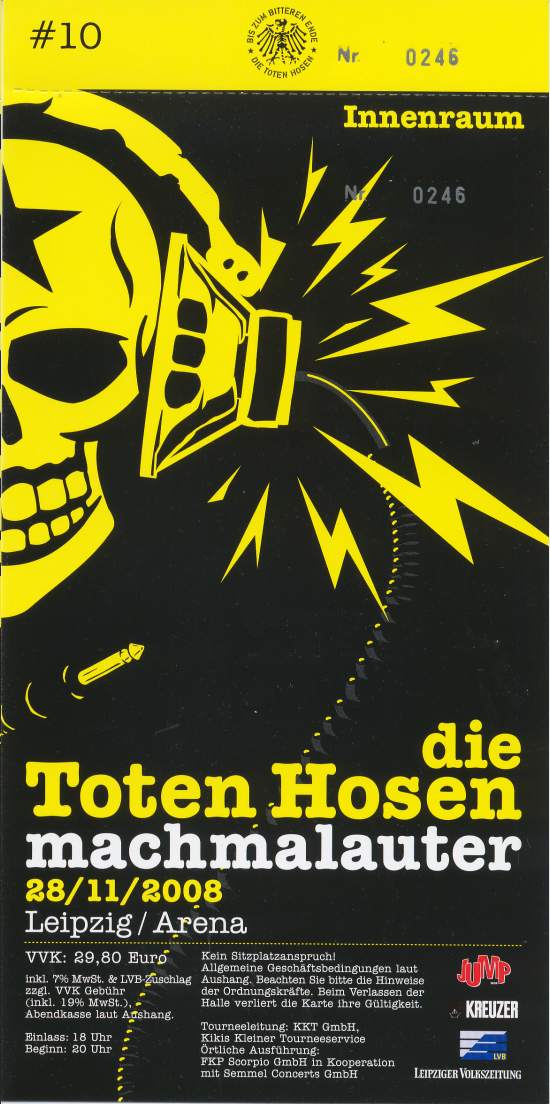 | Freitag, 28.11.2008 Leipzig Arena Ausverkauft 12.000 Etwas zeitiger als gewohnt und diesmal Angela und ich, machten wir uns gegen 17:00 Uhr auf den Weg nach Leipzig. In Hirschberg haben wir dann erst ein mal beim Marché etwas gegessen. Um 19:45 Uhr erreichten wir Leipzig, fuhren jedoch nicht zur Arena, sondern parkten in der Nähe vom "Stoned". Da wir nach dem Hosen Konzert noch in den Laden wollten, weil sich dort T.V. Smith angekündigt hatte. Bereits im Vorfeld nahmen wir Kontakt mit T.V. Smith auf, um zu klären, ob seine Konzert erst später beginnt, weil er ursprünglich zeitgleich mit den Hosen spielen sollte. |