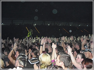 | Die freundlichen Herrn im Graben versorgten uns regelmäßig mit Wasser und kümmerten sich auch um die Kleinsten, erst bekam der Junge Ohrenstöpsel und später als das Gedränge zu groß wurde, durfte er das Konzert vom Graben aus weiter verfolgen. Mir gelang es eine von Campino geworfene Bierdose zu fangen, doch leider hab ich so fest zugedrückt, dass alle um mich rum nass waren und die Dose fast leer. | |