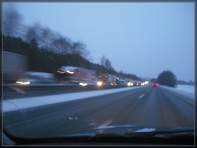 Um 06:45 Uhr machten sich Diego und ich auf den Weg Richtung Düsseldorf. Der Blick aus dem Fenster versprach nichts gutes, denn es hatte wie verrückt geschneit und geräumt war gar nichts. Wir kamen den Umständen entsprechend recht gut durch. Die auf der anderen Seite, mit dem Ziel in die Gegenrichtung, hatten da mal richtig Pech. Ich glaube es waren 20-30km Stau auf der Gegenspur. Selber Schuld, man muss halt die richtigen Ziele haben, Konzerte statt Skifahren, hab ich in Obertauern schon gesagt. Ist da nicht einer schon nach 5 Minuten beim Snowboarden verunfallt? ;-)