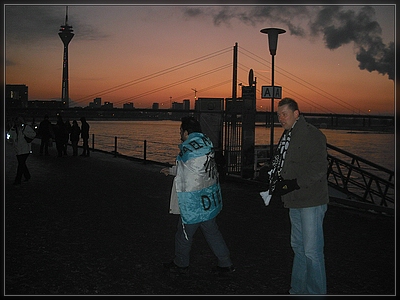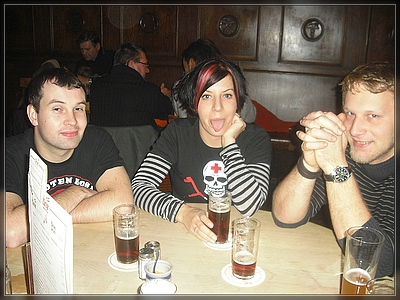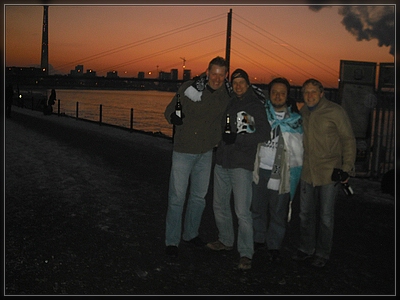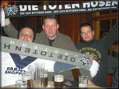 In der nähe von Würzburg nahmen wir unsere erste Mitfahrerin auf und kamen dann pünktlich bei unserem geplanten Zwischenziel um 10:00 Uhr in Frankfurt an. Dort trafen wir Christian und Nina und hatten noch ein lustiges Frühstück. Danach ging es zum Bahnhof um das Auto komplett zu überfüllen, wer hat da bloß so viel Gepäck dabei gehabt. Die Fahrt bis Düsseldorf war sehr witzig, die Stimmung war wirklich bombig. Am Südfriedhof parkten wir das Auto, tranken das erste Bier und die Gruppe zerteilte sich. Ara und Lucy mussten natürlich schon um 15:00 Uhr an die Halle, wie will man sich auch sonst ´ne Erfrierung zu legen. Christian machte noch Familienbesuch und Diego und ich gingen in die Altstadt um Carsten zu treffen. Ein kurzer Stopp im Pick Up und kurzes Schwätzchen mit Heiner, Diego bekam erst mal Einkaufsverbot, er hat eh schon Übergepäck. Anschließend ging es ins Uerige, war knacke voll, aber wir bekamen trotzdem sofort einen Tisch. Carsten ließ auch nicht lange auf sich warten und später trudelten noch Julie, Andi und Mike(?) ein. In meiner Bierlaune entschied ich mich mein Ticket für das zweite Konzert zu verkaufen und den 4.Advent bei Frau und Kind zu verbringen. Carsten adoptierte im Uerige noch "Otto". Dann kam ´ne Nachricht von den Blauköppen, doch wir trafen diese dann erst später zufällig im Gedränge des Hauptbahnhofes. Gemeinsam gingen wir auf die Jagd nach etwas zu Essen und erlegten dem Dönertier. In der Dönerbude durften wir Bier kaufen, aber nicht trinken und Klo´s gabs auch nicht. Gestärkt ging es weiter. Wir nutzten den Nahverkehr, wir hatten ja Konzert-Tickets die das beinhalteten, außer Diego, der stand ja auf der Gästeliste und fuhr quasi halblegal. Kontrolliert wurden wir nicht, aber die Diskussion wär bestimmt auch witzig geworden. Carsten hat in der Bahn schon mal alle in Stimmung gebracht und jeder Mitfahrer war anschließend Hosen und Carsten-Fan. Irgendwo stiegen wir aus irgendeiner Bahn, und besorgten Biernachschub. Dann ging es zum ISS Dom. Der Einlass hatte bereits begonnen und wir kamen auch gut rein, alle bekamen Bändchen für die erste Welle und die Party konnte beginnen.