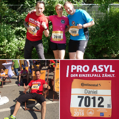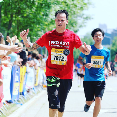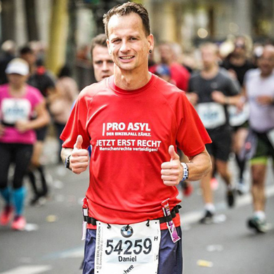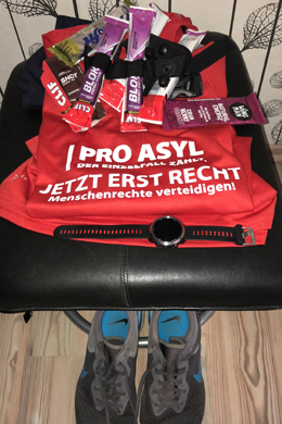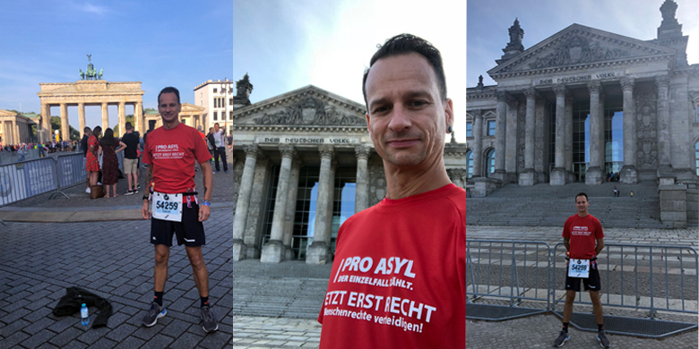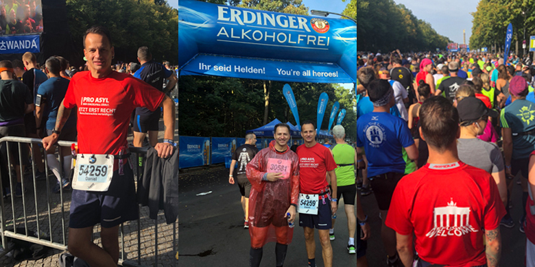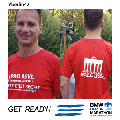 Bei den letzten Toten Hosen Konzerten durfte ich Pro Asyl unterstützen und die Idee entstand auch beim Marathon in Berlin Farbe zu bekennen, das daraus resultierende Laufshirt ist echt toll geworden und es gab während des Laufs immer wieder tolle Resonanz darauf. Natürlich sollte es am Samstagabend früh ins Bett gehn, aber die Aufregung war groß und so ging auch erst um halbeins das Licht aus. Der Wecker klingelte am nächsten Morgen um sechs. Der erste Läufer geht um 09:15 Uhr über die Start-Linie, mein Startblock H war aber erst um 10:15 dran. Also konnte mit dem Frühstück bis 07:00 gewartet werden. Früher öffnete der Bäcker eh nicht. Nach dem Frühstück ging es dann mit der U-Bahn Richtung Brandenburger Tor. Auf dem Weg dorthin nur nette Leute, die mir viel Glück wünschten, echt schön! Bei der Anmeldung zum Marathon musste man zwischen einem Kleiderbeutel zur Verwahrung oder einem Poncho nach dem Rennen wählen. Da ich bei der Kleiderabgabe bzw Abholung mit einem riesen Chaos rechnete, entschied ich mich für den Poncho. Aber ich musste vor Ort feststellen, dass alles wirklich sehr gut organisiert ist. Aber der Poncho, den ich nach dem Rennen erhielt, ist wirklich sehr schick ;-) |