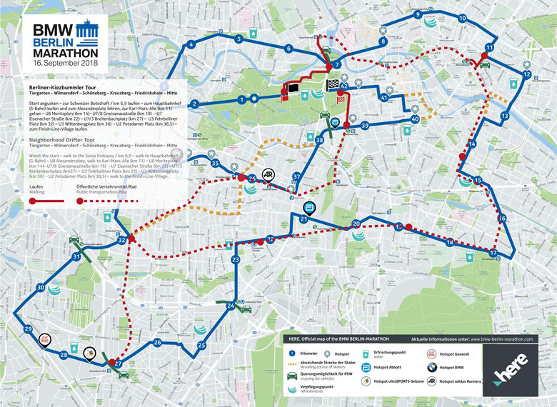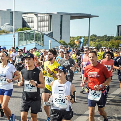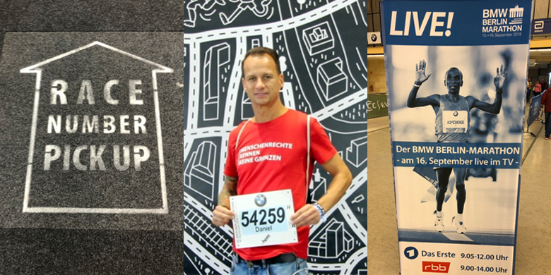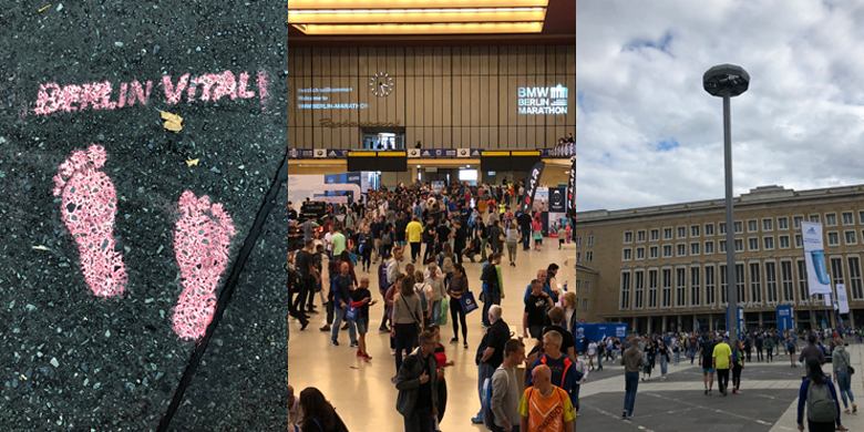 | Am Freitag Nachmittag ging es nach Berlin. Samstag bisschen Stadtbummel, lecker essen und dann auf die Sport-Messe Berlin Vital im Flughafen Tempelhof, die Startnummer abholen. Alles bestens organisiert und überall eine tolle Stimmung. Man konnte auch auf einem Laufband die Geschwindigkeit des Top-Favoriten Eliud Kipchoge testen. Mit Sicherheits-Gurt. Einige kamen da innerhalb von wenigen Sekunden an ihre Grenzen und Kipchoge läuft das Tempo 42km, 2 Stunden, also permanent 100 Meter in 17 Sekunden... puh. |