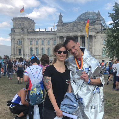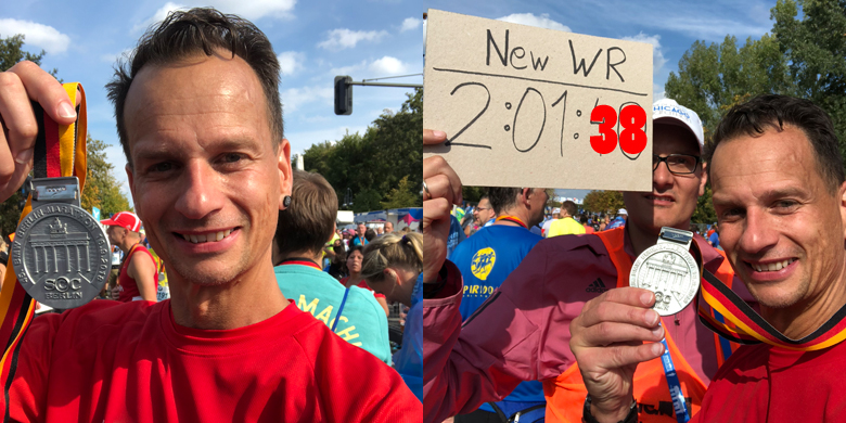 Die ersten 20 Kilometer waren echt toll und vergingen einfach. Ich weiß nicht mal mehr genau wo ich so war. Ich musste jedoch die ganze Zeit auf die Toilette. An jeder Versorgungsstation standen einige Dixie-Häusschen, die waren jedoch immer sehr begehrt und ich wollte mir meinen Plan "unter-4-Stunden" nicht durch anstehen vermurksen. Nach etwa 22 Kilometern bekam ich dann Rückenschmerzen, ich konnte diese nicht richtig zuordnen und beschloss nun endlich meine Blase zu leeren, so richtig ausgeschwitzt hatte ich das Problem nicht. Also bei KM 25, nach 2 Stunden 21, dann endlich ein Dixie ohne anstehen. Hiernach gab es dann den ersten merklichen Leistungsabfall, ich fühlte mich zwar befreit, aber das Stehenbleiben und dann wieder Loslaufen, wurde immer beschwerlicher, jede Trinkpause warf mich weiter zurück. Ich merkte wie meine gewünschte Zielzeit immer unrealistischer wurde und verlor dadurch auch eine menge an Motivation. Eins kam mir allerdings nie in den Sinn: nicht anzukommen. Das war keine Option und hatte in all der Vorbereitung und auch während des Laufs keine Rolle gespielt. Bei KM 40 konnte ich dann auch nur noch Gehen und es fühlte sich wie eine Niederlage an. Die letzten paar hundert Meter vorm Brandenburger Tor trabte ich wieder an, denn ins Ziel muss schon gelaufen werden. Es war wirklich toll durch das Brandenburger Tor und den gleichen Zieleinlauf wie der neue Weltrekordhalter Eliud Kipchoge zu laufen. Ein "Life-Goal" habe ich erreicht, weitere folgen, natürlich noch ein Marathon unter 4 Stunden ;-) und vielleicht auch mal ein Triathlon... |