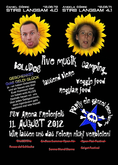Der 81. Geburtstag unseren 40. und 41. Geburtstag wollten wir etwas größer feiern und haben einfach versucht alle Leute einzuladen die wir gerne haben. Wir versprachen 1000 Biere, Livemusik, gutes Essen und Boludos - es sollte keiner enttäuscht werden. Unsere Begeisterung steigerte sich ins unermessliche, nach dem unsere Wunschbands zugesagt haben, Swagman fürs Essen gebucht werden konnte und immer mehr Leute ihr kommen ankündigten. Es ist einfach unfassbar welche Wege und Strapazen auf sich genommen wurden, um unsere Party zu feiern. Kein Weg war zu weit, keine Verbindung zu ungünstig und kein anderes Festival war wichtiger (mit Ausnahmen - aber die werden beim nächsten mal einfach nicht berücksichtigt). seht selbst: weiter |
