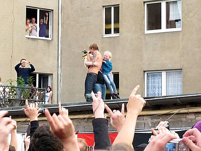 ![]() wenn ich das richtig gesehen habe, haben die Kinder auch bereits seid 14:00 Uhr vorm James gewartet und durften dann nicht hinein, haben aber denke ich den besten Platz auf dieser Terrasse bekommen. |
