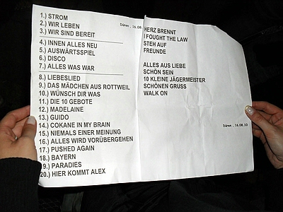 SETLIST: 01. Strom 02. Und wir leben 03. Wir sind bereit 04. Innen alles neu 05. Auswärtsspiel 06. Disco 07. Alles was war 08. Liebeslied 09. Das Mädchen aus Rottweil 10. Wünsch DIR was 11. Die zehn Gebote 12. Madlaine 13. Guido 14. Cokane in my brain 15. Niemals einer Meinung 16. Alles wird vorübergehn 17. Pushed Again 18. Bayern 19. Steh auf, wenn du am Boden bist 20. Blitzkrieg Bop 21. Hier kommt Alex 22. Verschwende deine Zeit 23. Shake Hands 24. I fought the law 25. Freunde 26. Alles aus Liebe 27. Schön sein 28. 10 kleine Jägermeister 29. Schönen Gruß, auf Wiederseh’n 30. You’ll Never Walk Alone 31. Freitag der 13. 32. Reisefieber 33. Liebesspieler 34. Wort zum Sonntag |